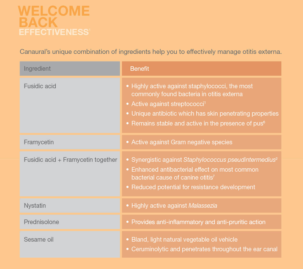 Active ingredient: Canaural is an oily suspension of the active ingredients diethanolamine fusidate, framycetin sulphate, nystatin, prednisolone, sesame oil.